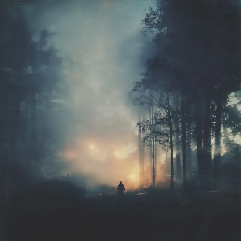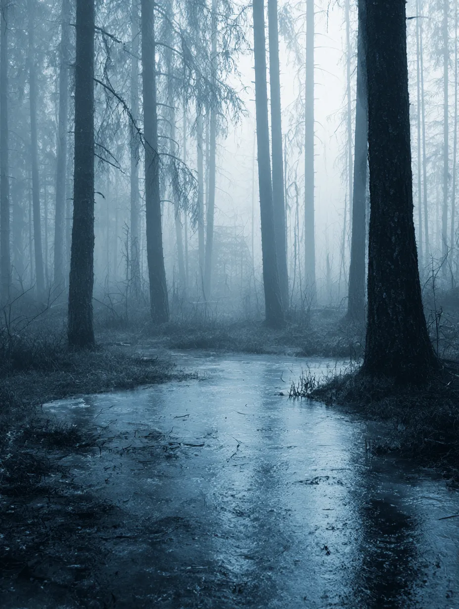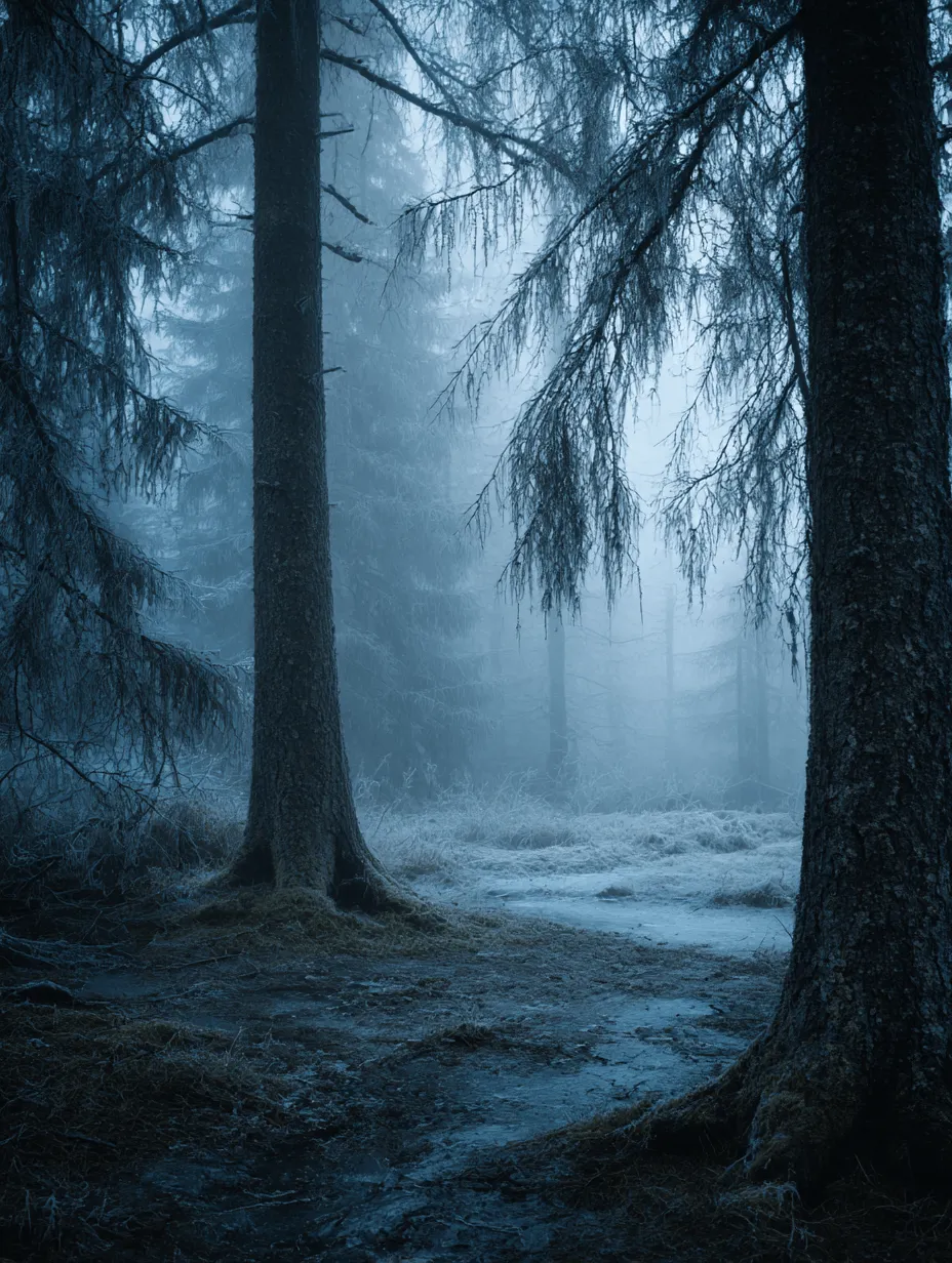 the woods were too quiet. not peaceful—the way a cave mouth is quiet, or a grave. sound should have lived here. the brittle snap of wind in the trees, the mutter of snow falling, branches shifting under their own weight.